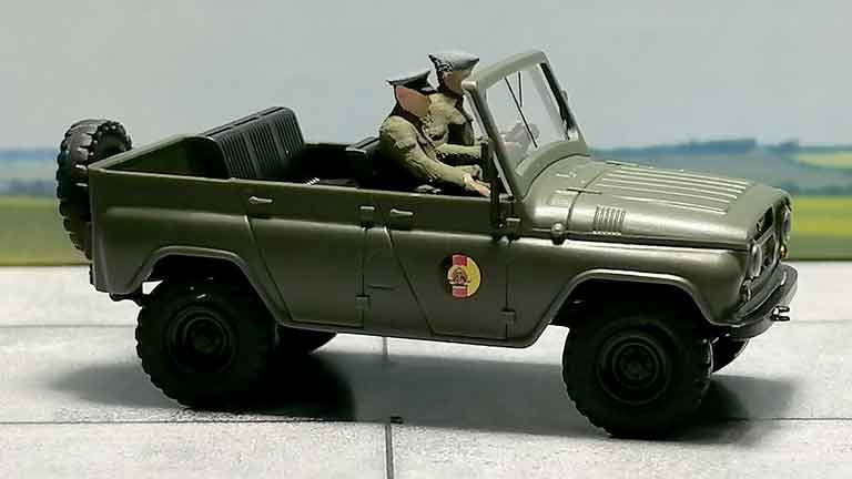 Масштабная модель легкового автомобиля УАЗ 469 с фигурками (NVA — Nationale Volksarmee) произведена в полном соответствии оригиналу в историческом и техническом плане. Окраска модели не требуется. Рекомендуется для диорам в масштабе 1/87 и железнодорожных макетов типоразмера Н0 (1:87).