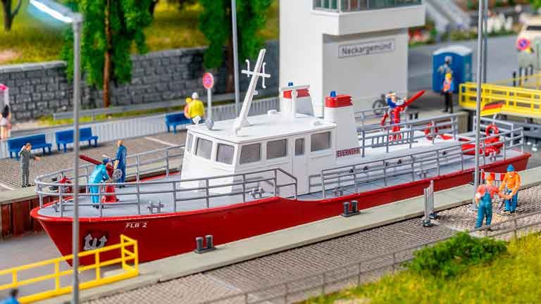 Модель малого красного пожарного катера (модель по ватерлинии - не плавучая) предназначена в первую очередь для использования на внутренних водных путях и реках. Благодаря остроконечному корпусу и белой рулевой рубке с четкой надписью »Пожарная команда« он отправляется на следующее задание. В просторном грузовом отсеке есть место для различного противопожарного оборудования, а в комплект входит спасательная шлюпка красного цвета.