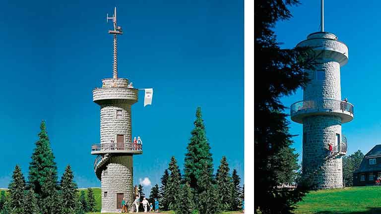 Узкая двухэтажная смотровая башня из натурального камня с открытой лестницей в нижней части и смотровой площадкой наверху. Оригинальная башня находится недалеко от Гютенбаха/Шварцвальда.