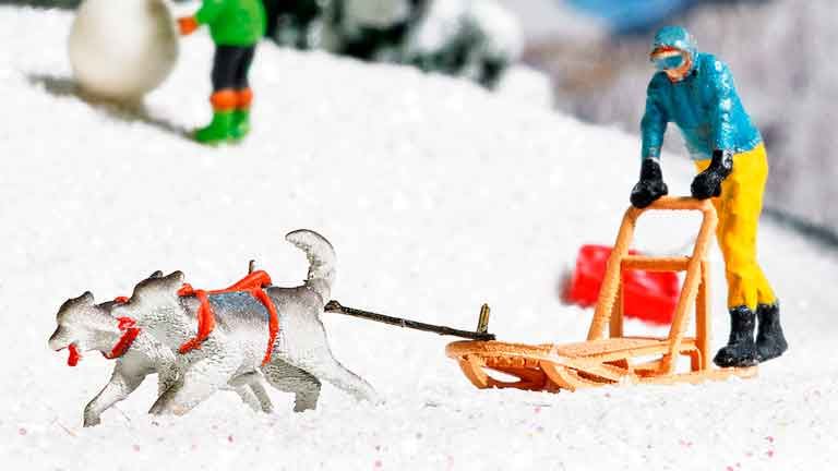 В наборе - собачья упряжка, две лайки и водитель в синей куртке. Готовая модель.