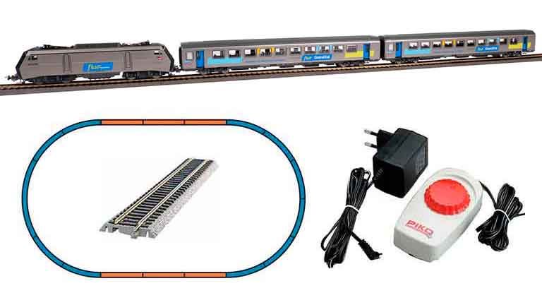 Стартовый набор модельной железной дороги «Пассажирский поезд с электровозом BB 26000 и двумя вагонами» с аналоговой системой управления. NEM 362 с закрытым механизмом сцепления (KK-Kinematik). Рекомендуется для железнодорожных макетов, диорам и миниатюр в масштабе 1/87 типоразмера H0.