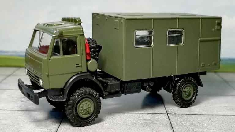 Коллекционная модель «Автомобиль грузовой КабАЗ (металлическая будка полевой ремонтной мастерской, 2 моста, полный привод 4х4)» из пластика рекомендуется для диорам в масштабе 1/87 и железнодорожных макетов типоразмера Н0 (1:87). Окраска модели не требуется.